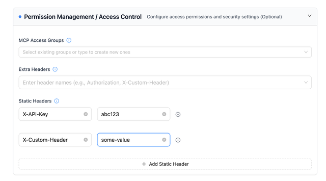Sometimes your MCP server needs specific headers on every request. Maybe it's an API key, maybe it's a custom header the server expects. Instead of configuring auth, you can just set them directly.