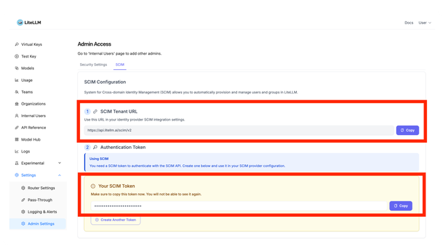On LiteLLM, navigate to the Settings > Admin Settings > SCIM. On this page you will create a SCIM Token, this allows your IDP to authenticate to litellm /scim endpoints.